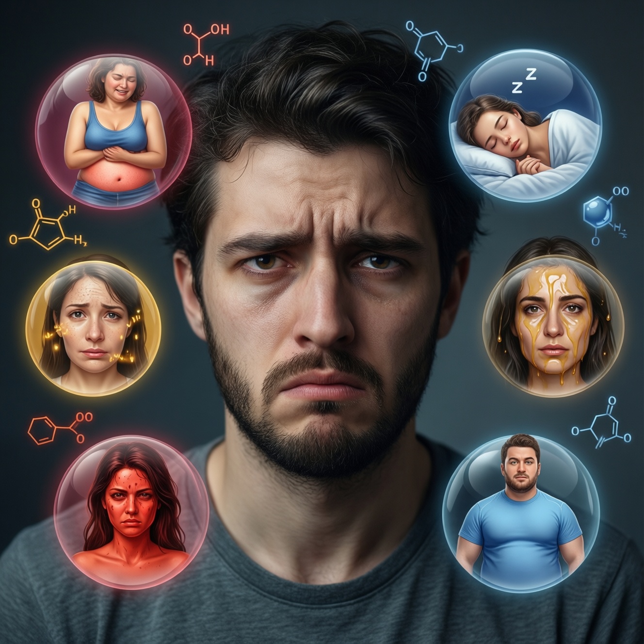Кожа - "экран" системных процессов: стресс, колебания гормонов, инсулиновые пики и воспаление часто проявляются высыпаниями, покраснением, зудом, ухудшением барьера. При этом уход может либо поддержать восстановление, либо постоянно "срывать крышу" коже.